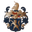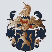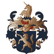 Wapen met een eenhoorn en een kroon, versierd met bladeren en ornamenten.